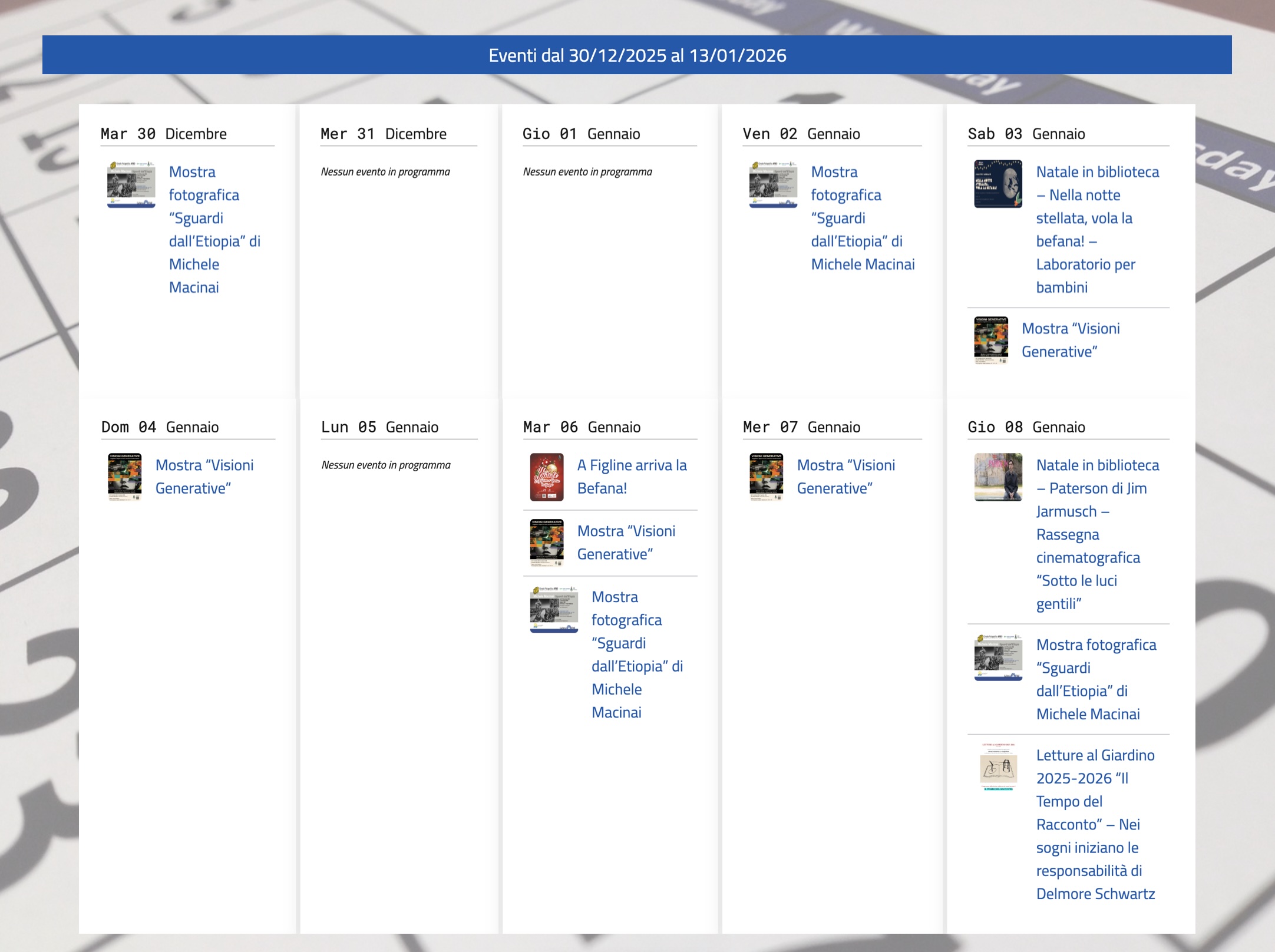 Prosegue inoltre la mostra fotografica “Sguardi dall’Etiopia” di Michele Macinai, al Circolo Fotografico Arno (visitabile ogni martedì e giovedì, in orario 15-17, e il venerdì, in orario 21-23. Possibilità di visita su prenotazione scrivendo a info@arnofoto.it); così come la mostra “Visioni Generative” di Viktoria Blank e Emanuele del Fio a Palazzo Pretorio (visitabile tutti i sabati e domeniche in orario 10-13 e 15-19, fino al 7 gennaio 2026).