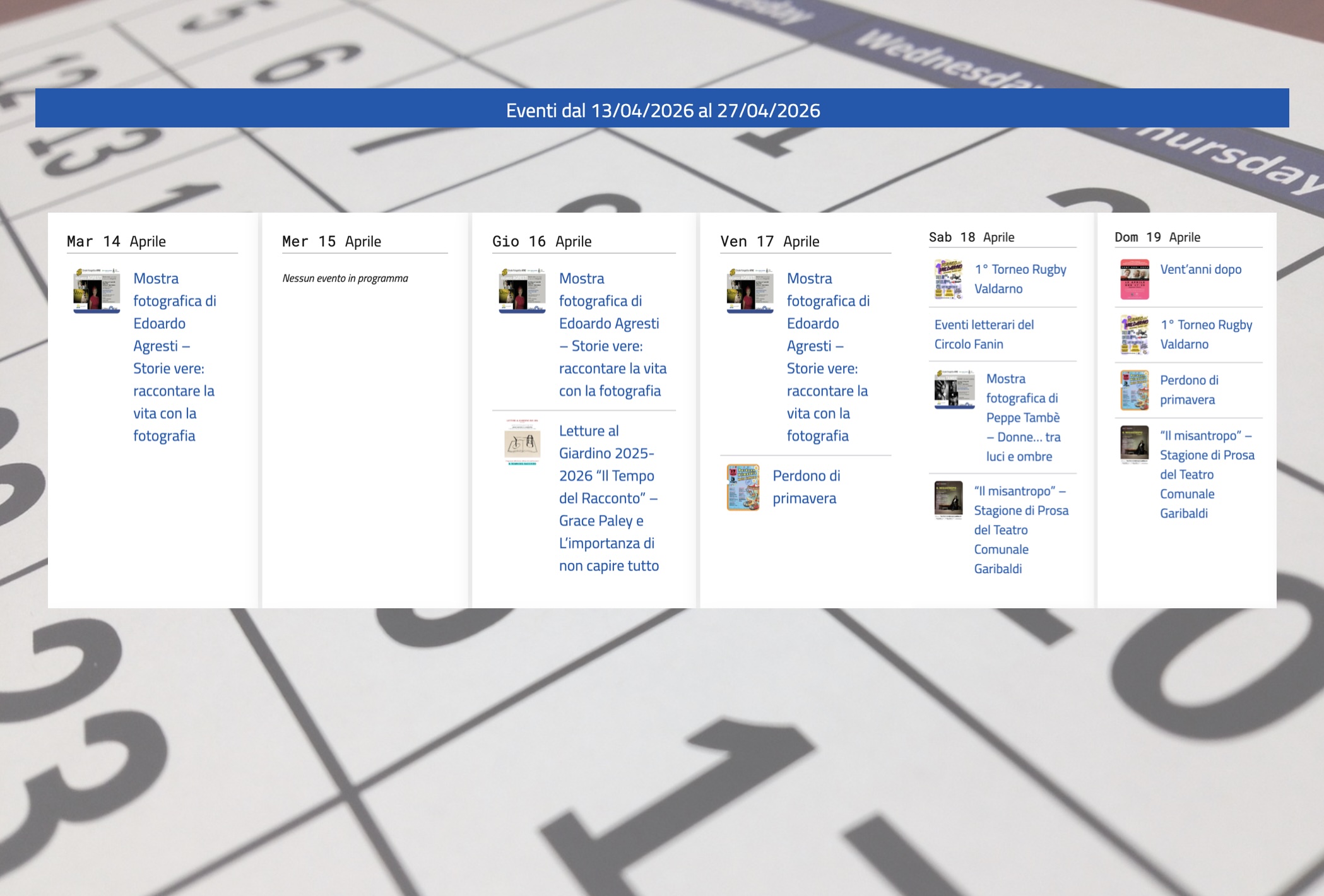 Si parte con la mostra fotografica di Edoardo Agresti “Storie vere: raccontare la vita con la fotografia”, allestita nella Galleria Fiaf del Circolo Fotografico Arno (via Roma, 2 a Figline, ingresso gratuito) e visitabile nelle giornate di martedì e giovedì, dalle 15 alle 17 ed il venerdì dalle 21 alle 23. Restando in tema di fotografia, sabato 18 aprile, alle 16,30, il circolo fotografico Arno inaugurerà, alla galleria Fiaf (via Roma, 2, Figline) la mostra fotografica del ritrattista Peppe Tambè, “Donne…tra luci e ombre”, che sarà poi visitabile gratuitamente ogni martedì e giovedì dalle 15 alle 17, ed ogni venerdì dalle 21 alle 23, fino al 30 Maggio. Per chi vuole seguire l’inaugurazione da remoto, è possibile richiedere le credenziali di accesso Zoom all’indirizzo info@arnofoto.it