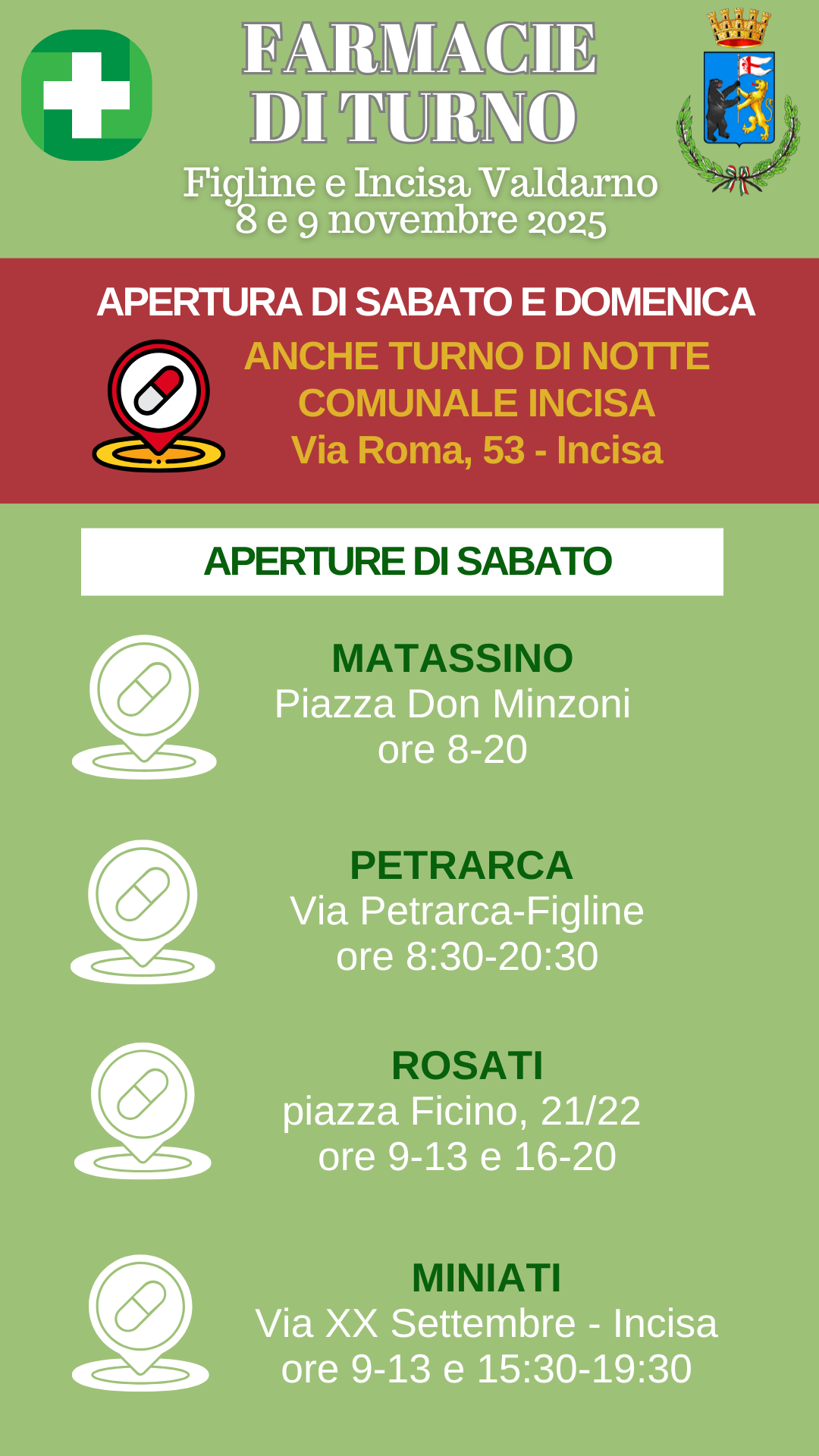 Ecco di seguito le farmacie di turno aperte il fine settimana dell'8 e 9Â novembre a Figline e Incisa Valdarno.