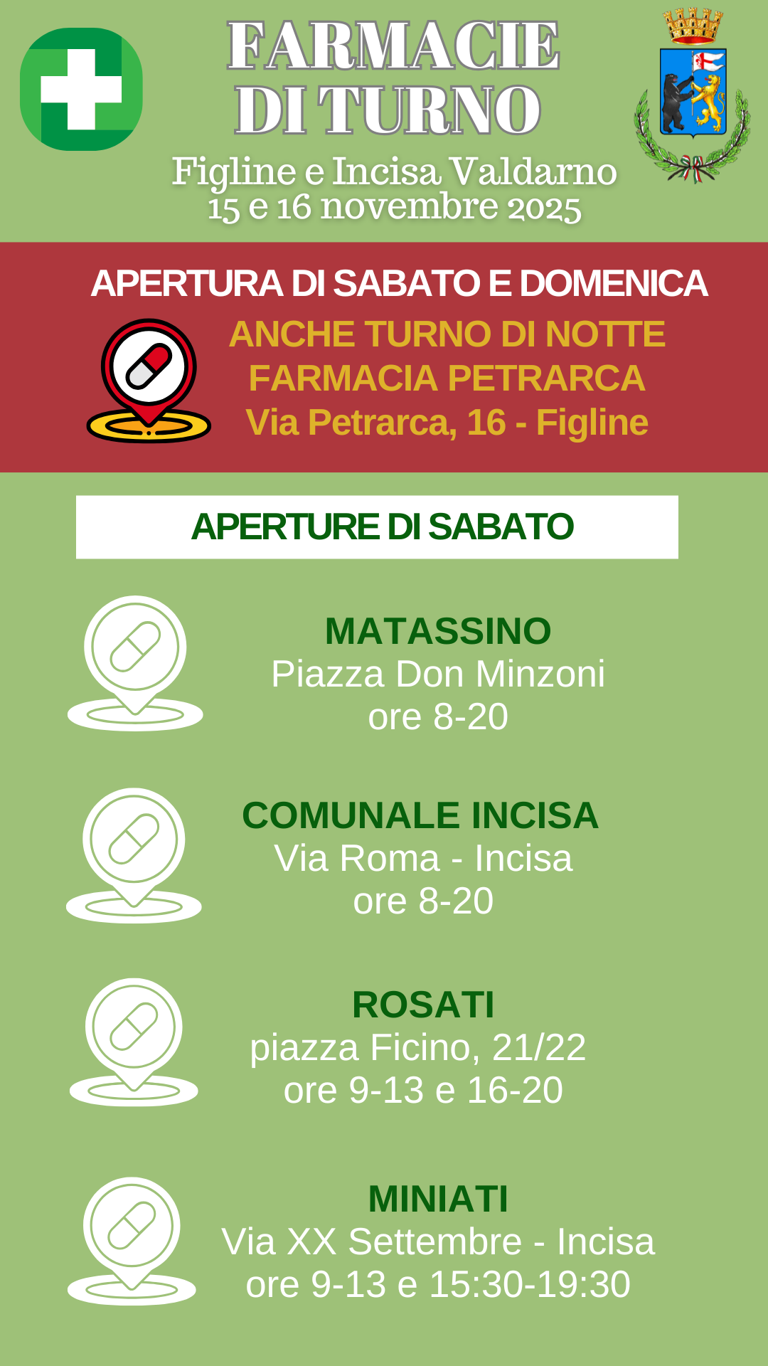 Ecco di seguito le farmacie di turno aperte il fine settimana del 15 e 16Â novembre a Figline e Incisa Valdarno.