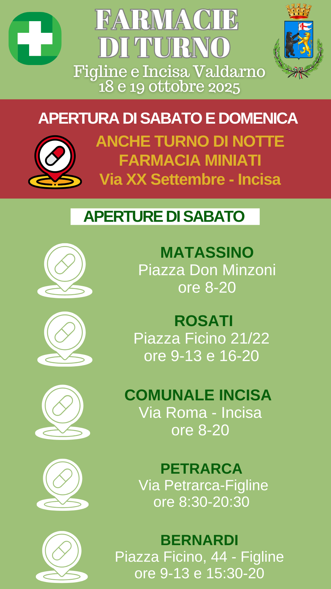 Ecco di seguito le farmacie di turno aperte il fine settimana del 18 e 19Â ottobre a Figline e Incisa Valdarno.