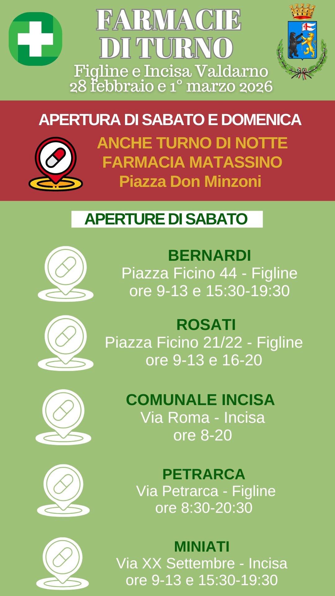 I turni delle farmacie del 28 febbraio e 1° marzo a Figline e Incisa Valdarno