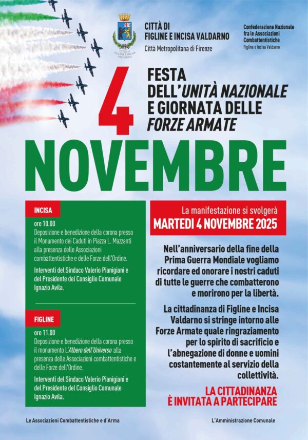 Giornata dell’Unità Nazionale e delle Forze Armate, doppia celebrazione a Figline e Incisa