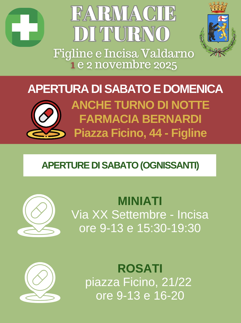 Ecco di seguito le farmacie di turno aperte il fine settimana del 1° e 2 novembre a Figline e Incisa Valdarno.