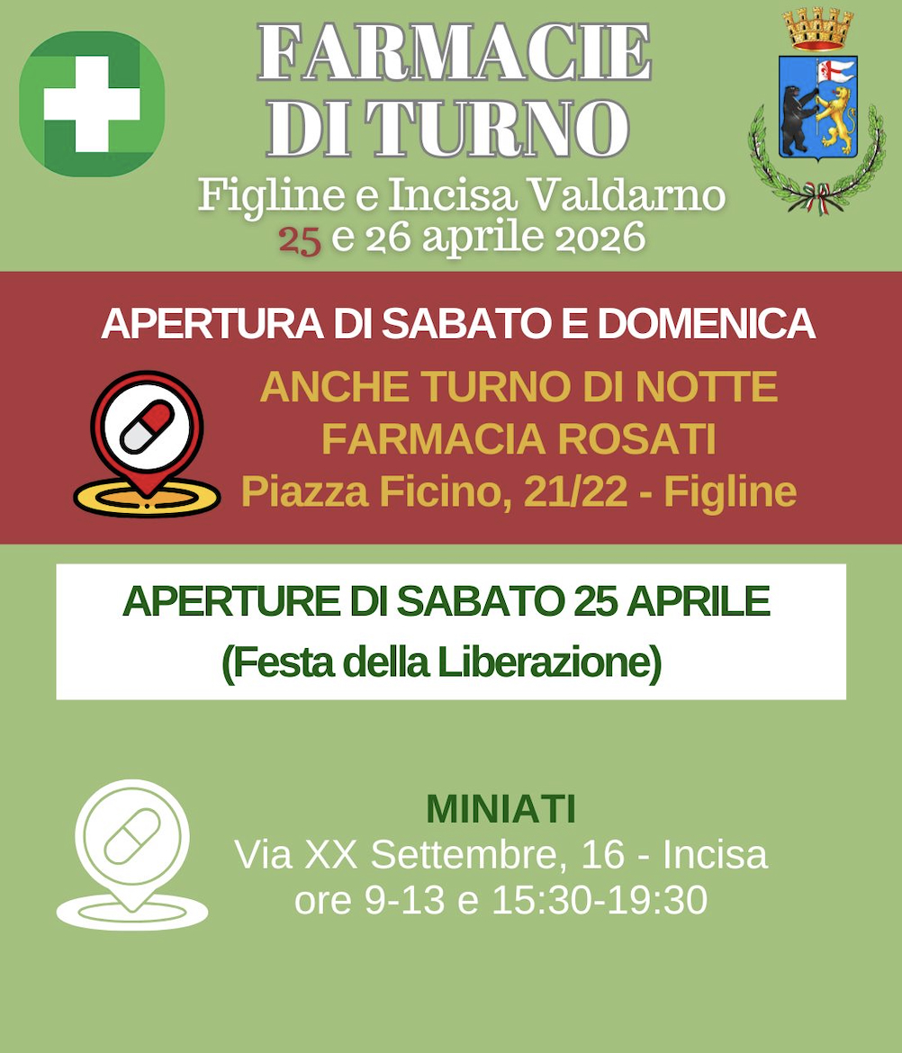 Ecco di seguito le farmacie di turno aperte sabato 25 (Festa della Liberazione) e domenica 26 aprile a Figline e Incisa Valdarno.