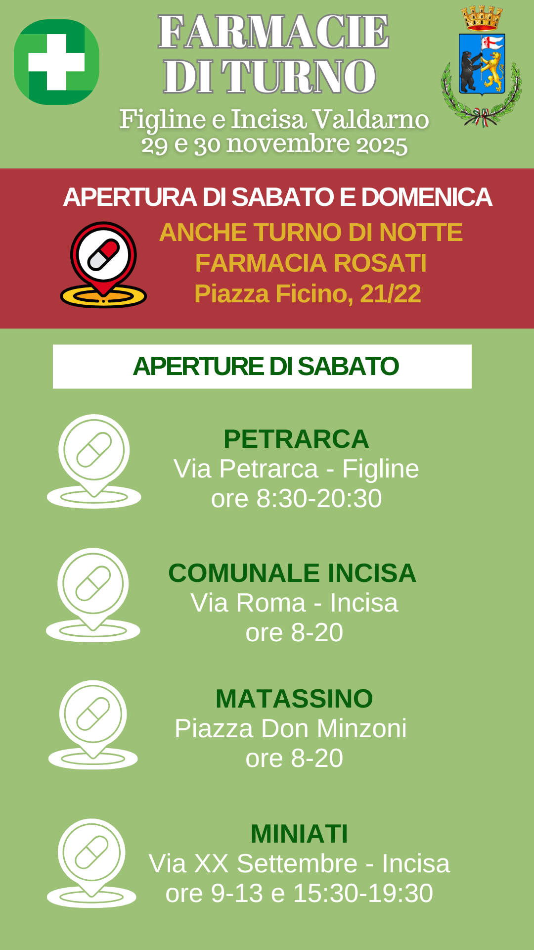 Ecco di seguito le farmacie di turno aperte il fine settimana del 29 e 30 novembre a Figline e Incisa Valdarno.