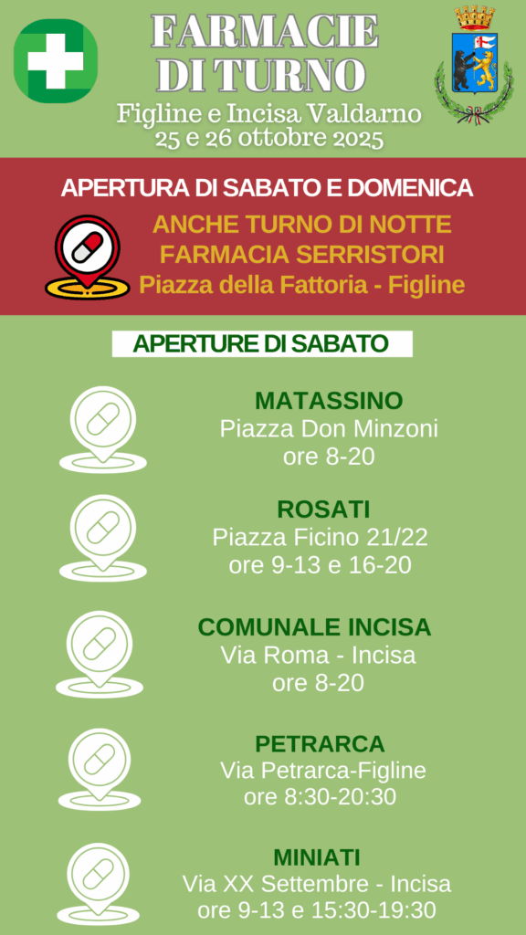 Ecco di seguito le farmacie di turno aperte il fine settimana del 25 e 26Â ottobre a Figline e Incisa Valdarno.
