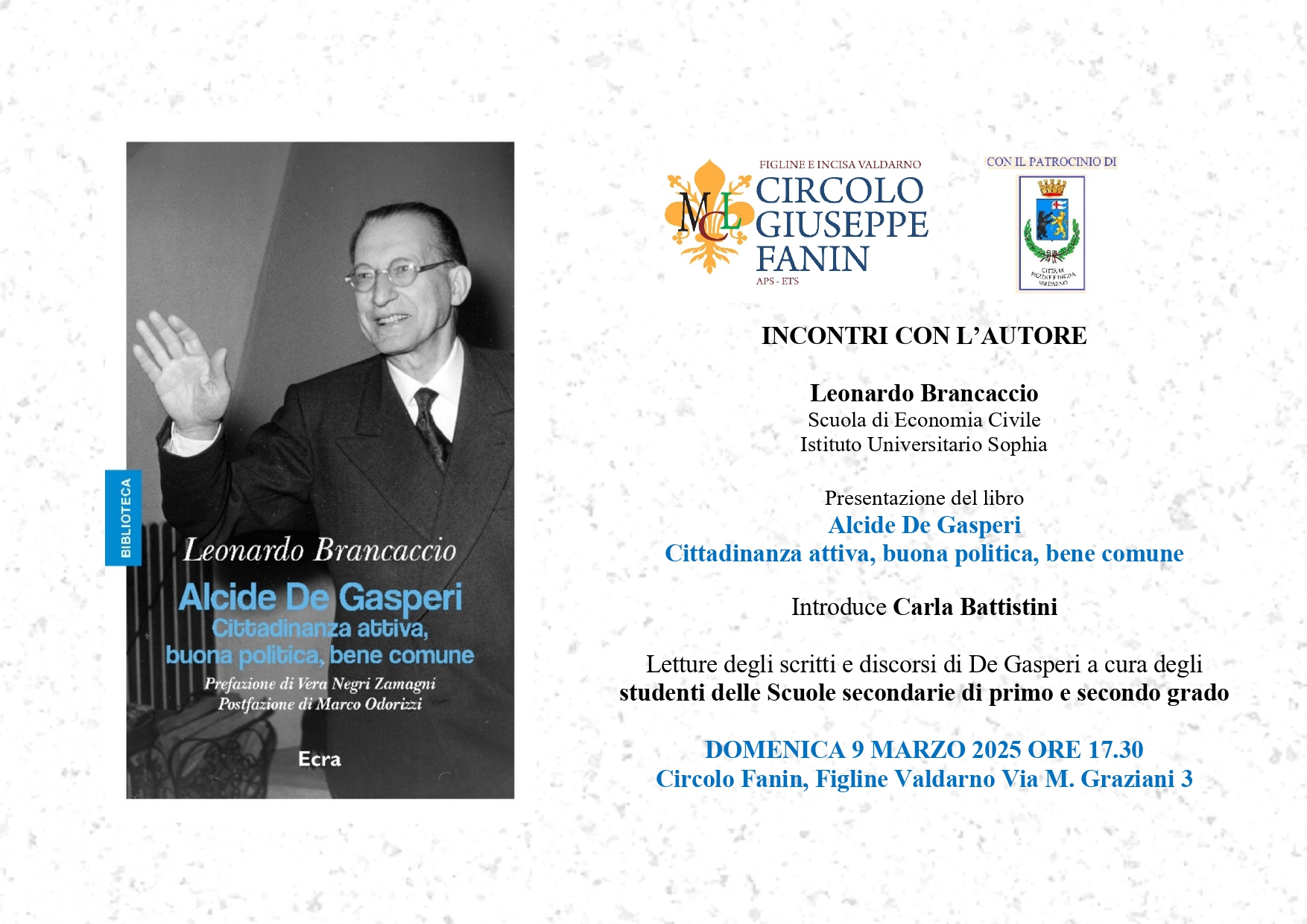 Si intitola "Alcide de Gasperi. Cittadinanza attiva, buona politica, bene comune" il libro, firmato da Leonardo Brancaccio, che sarà presentato domenica 9 marzo alle ore 17.30,presso il Circolo Fanin (Via Giovanni Magherini Graziani, 3).
