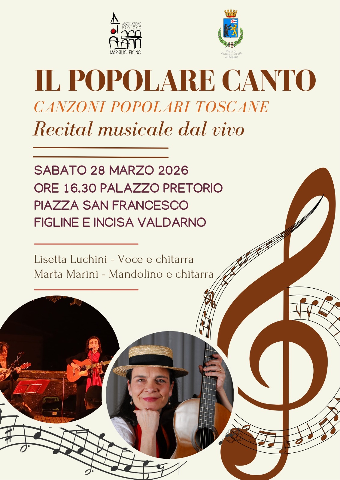 Sabato 28 Marzo, alle ore 16:30, la cantante e musicista Lisetta Luchini, accompagnata al mandolino e alla chitarra da Marta Marini, sarà al Palazzo Pretorio di Figline e Incisa Valdarno per un incontro dedicato alle canzoni della tradizione popolare toscana.